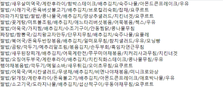 return <p> {meal.codeNm} {meal.mealDate} {meal.mealKindGcd} {meal.mealNm}</p>