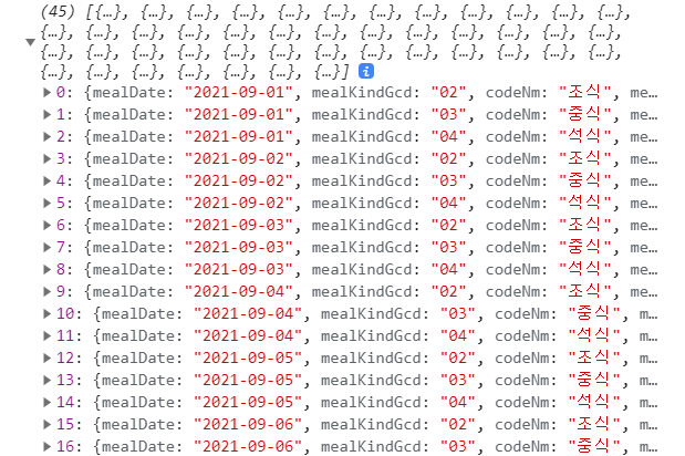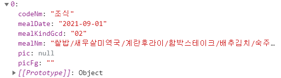 활용할 식단 데이터는 codeNm (조-중-석식 구분), mealDate (식단 날짜), mealNm (식단 정보) 등으로 구성되어 있으며, 데이터 중 자신이 필요한 데이터를 파악해 js 코드를 작성해준다.