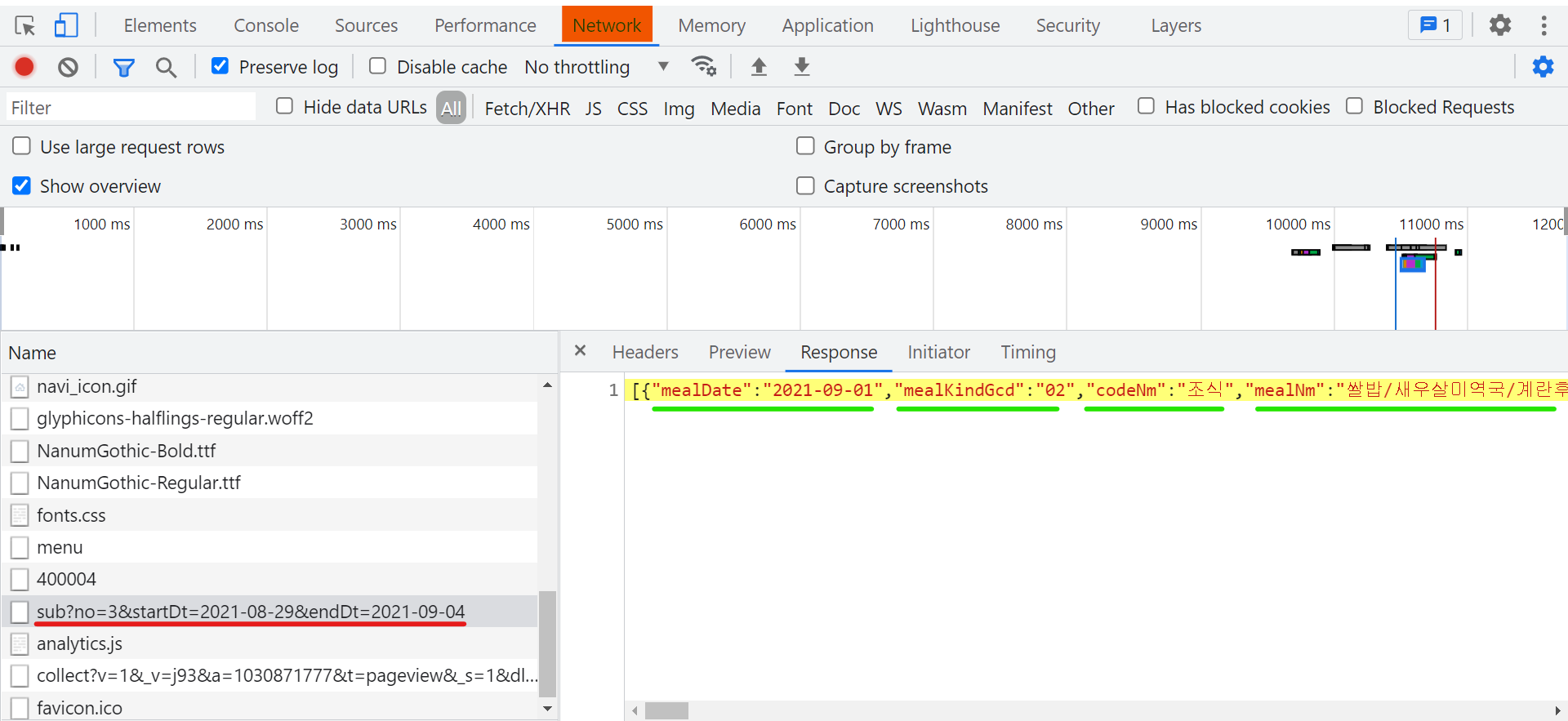 2 . 개발자 도구 ( F12 ) 속 - Network 창에 접속해 식단 데이터가 담긴 파일을 확인한다.