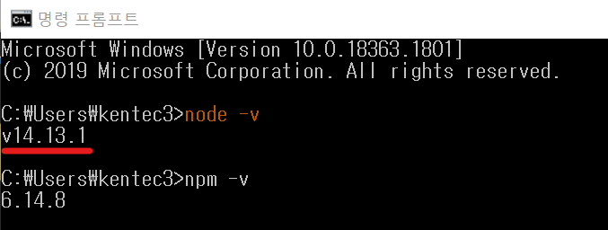 ์ค์น ์๋ฃ๋ Node๋ cmd ์ฐฝ์ ํตํด ๋ฒ์ ํ์ธ์ด ๊ฐ๋ฅํ๋ค.