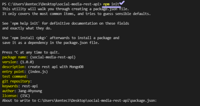 - 터미널에 npm init 입력 & 몇가지 질문 사항에 대해 답변 ( Enter 키 끝까지 눌러준다 )