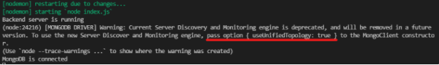 → 실행결과 오류가 뜨면서 성공되므로 코드에 useUnifiedTopology: true 부분을 추가시켜준다.