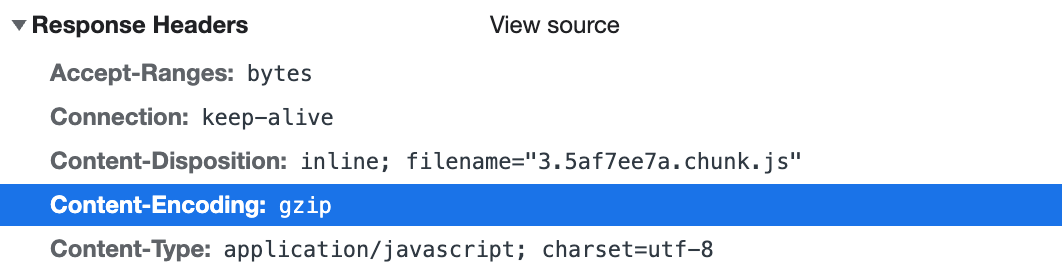 압축으로 번들 사이즈가 실제 줄어들었는지 확인하기 위해선 Content-Encoding: gzip 설정 확인을 통하여 알 수 있습니다.