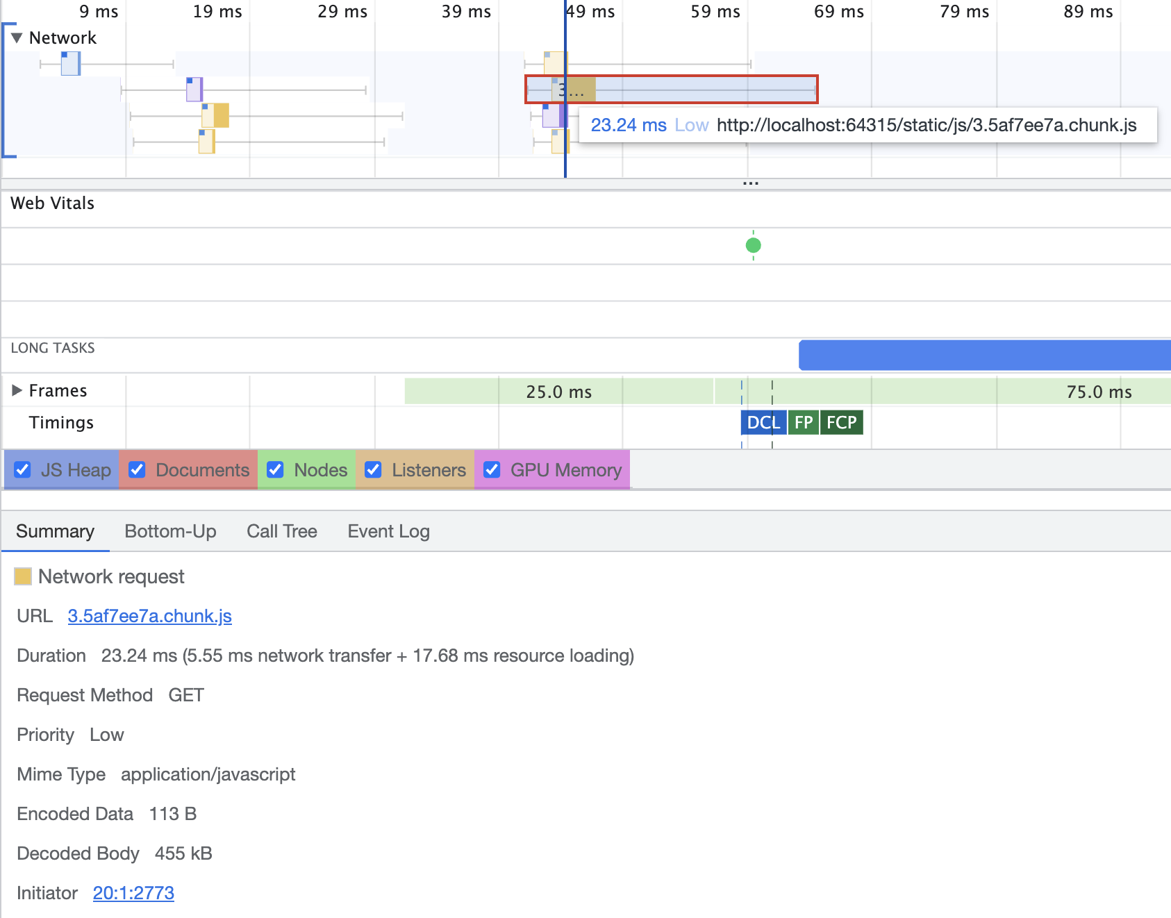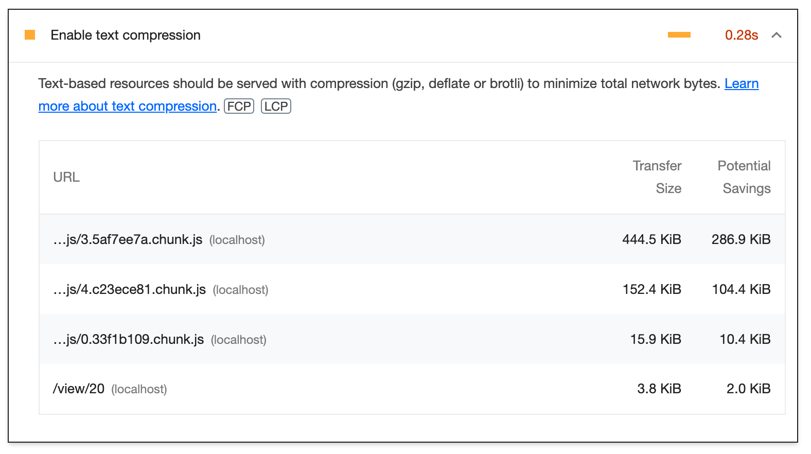 실제 압축으로 성능 개선을 비교하기 위해 Content-Encoding 헤더를 통한 압축 확인하고, 테스트용 Production 환경으로 빌드된 코드를 실행하여 기존 성능 검사와 비교해보겠습니다.